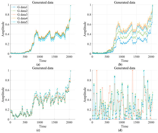 Generated data by VAE-GAN with noise standard deviation of different value. (a) value = 0.001; (b) value = 0.01; (c) value = 0.1; (d) value = 1.