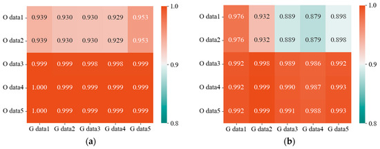 Since Pearson’s correlation coefficient heat map of the samples generated from the training set Bearing A2 using VAE-GAN with the original samples has been shown in Figure 6, the experiments yielded that the samples generated from the other training sets also exhibit a strong linear correlation with the original samples. Therefore, the heat maps of the correlation coefficients of the other training set bearings are not shown. This indicates that the generated sample maintains the information and structure of the original sample to some extent.
