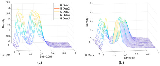 The kernel density map of generated data with different noise standard deviation. (a) value = 0.001; (b) value = 0.01.