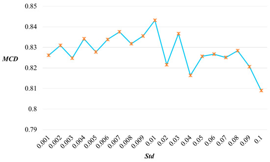 It is observable that the maximum value of this index is at a standard deviation of 0.01, and MCD values with too large or too small a standard deviation exhibit oscillations around the maximum value. This phenomenon occurs because, in cases where the standard deviation of the data is large, there is high data diversity but relatively lower relevance to the original data. On the other hand, when the standard deviation of the data is small, the data exhibit high relevance, but there may be a lack of diversity in the dataset. Therefore, the standard deviation of noise variable introduced into VAE is set to 0.01.