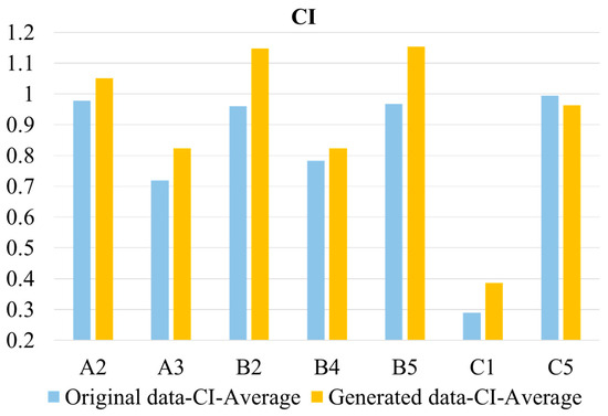 Figure 9 compares the CI values of the generated data with the original data for the training set data, which are shown here after averaging the CI values of the five feature parameters for each bearing. As described in Equation (8) in Section 3.1.2, the CI is calculated as the combination of monotonicity, correlation, and robustness of the data. The values clearly indicate that the CI values of the generated data predominantly surpass those of the original data. This indicates that the generated samples enhance the depiction of the bearing degradation state, potentially improving the model’s performance and the reliability of the RUL prediction outcomes.