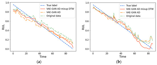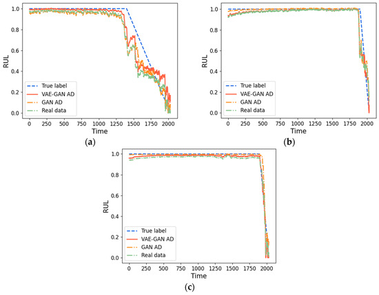The plots of the prediction results from the three datasets used for RUL show a notable divergence between the predicted and actual RUL in the initial phase of degradation, attributable to the lack of effective degradation information. Predictions are closer to the true RUL when a large amount of degradation information is available during the middle and late phases of degradation. In the case of different training data and the same prediction model, the augmented data generated by VAE-GAN have a smaller RMSE and a higher R2-SCORE, suggesting that the features augmented by VAE-GAN have a more robust regression relationship with the RUL, and the CNN-LSTM prediction model can extract the temporal information more efficiently, leading to enhanced prediction accuracy.