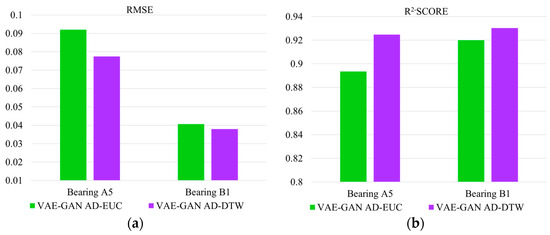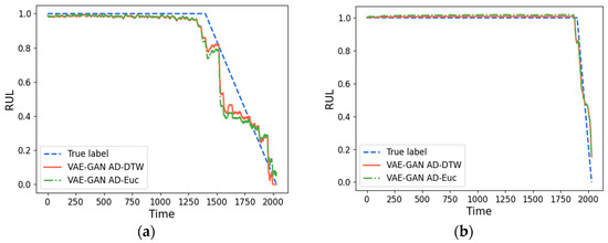 The augmented data and the target data are matched by DTW similarity, and then the weighted fusion data are obtained. The weighted fusion data of each bearing in the training set are trained with the corresponding label input network, and the test data are then applied to the trained network to acquire the RUL prediction results. To demonstrate the advantages of DTW in computing similarity between time series, the two training datasets used in experiment 2 are DTW weighted fusion of VAE-GAN AD (VAE-GAN AD-DTW for short), and the Euclidean distance weighted fusion of VAE-GAN AD (VAE-GAN AD-EUC for short). The results acquired from the prediction of these two training set data are compared. The results of this experiment are plotted in Figure 12, the evaluation metrics of the prediction results are summarized in Table 4. Furthermore, Figure 13 showcases the visualization of the prediction results.
