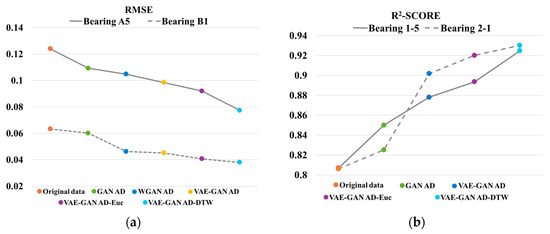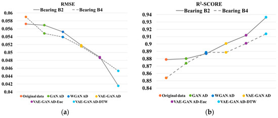 The outcomes suggest that the proposed method consistently delivers superior results. While Table 5 above shows that some R2-SCORE indicators are negative, and the reason may be that the failure types of test set Bearings A4 and C2 are cage failures or compound failures with cages, but the failure types of training set bearings are both inner and outer ring failures. Generally, it is readily apparent that expanding the data set and introducing similarity analysis into time series can improve the prediction accuracy. Combining DTW similarity weighting with VAE-GAN sample generation method can build fusion data highly similar to the target series to enhance the prediction model, which has important practical application value for time series prediction tasks.