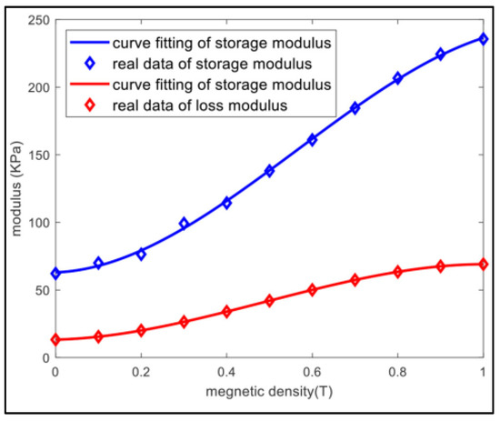 Comparison of Experimental Data and Curve Fitting Representation of Storage and Loss Moduli vs. Magnetic Flux Densities at 2 Hz and 15% Shear Strain [16].