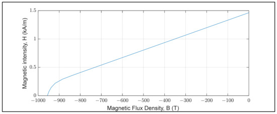 Permanent magnets are also included into the electromagnet design to be able to both increase and decrease the stiffness of the MRE with respect to the initial configuration with an input current of 0 A. N52 neodymium permanent magnets, that have a density of 7500 kg/m3 [21], are included in the electromagnet design to help increase the magnetic flux density when the current direction to the electromagnet is positive and decrease when the current is negative. The N52 permanent magnet has a magnetic remanence of 1.464 T and a coercivity of 956 kA/m [22]. The initial magnetization B-H curve for the N52 magnet is provided by Finite Element Magnetic Methods (FEMM) solver application; however, the provided curve must be offset by the remanence to obtain the demagnetization curve, which is shown in Figure 2.