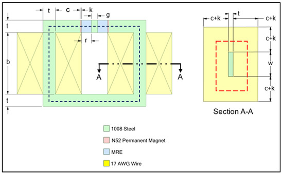 Figure 3 shows the layout of the proposed electromagnet design including the relevant materials and geometrical dimensions along with a section view of the solenoid. It is noted that extending beyond the permanent magnet will result in the copper windings interfering with the MRE’s deflection. The number of windings is approximately determined by dividing the area covered by the wires by the cross-sectional area of the wire and can be obtained as follows: