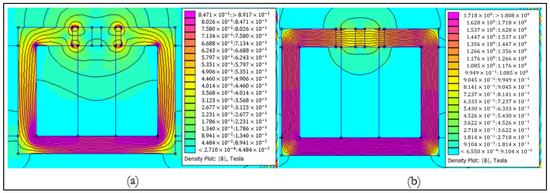 (a) FEMM Results for Input Current of −3 A; (b) FEMM Results for Input Current of 3 A.