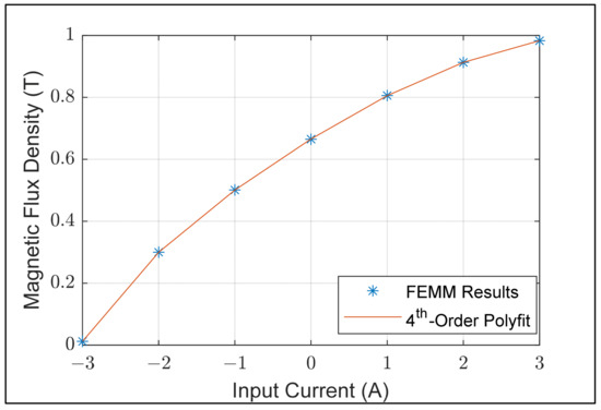 Comparison of the FEMM Results with the Curve Fitted 4th-Order Polynomial of the Magnetic Flux Density vs. Input Current Curve.