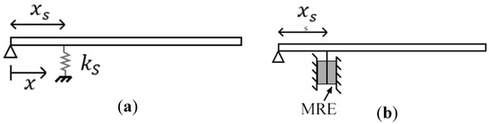 A beam with an intermediate linear spring support at is used as the alternative beam model. This model is otherwise known as an overhanging beam, as shown in Figure 6a, and may represent the cantilever beam if the linear spring is infinitely rigid. The model having the intermediate spring is selected since the MRE can be placed in such a way that it is in direct shear as shown in Figure 6b. Two MRE pads placed in a parallel configuration are used as per the electromagnet design and to increase the stiffness at the support. The equivalent total complex stiffness due to the MRE in shear can be defined as follows: