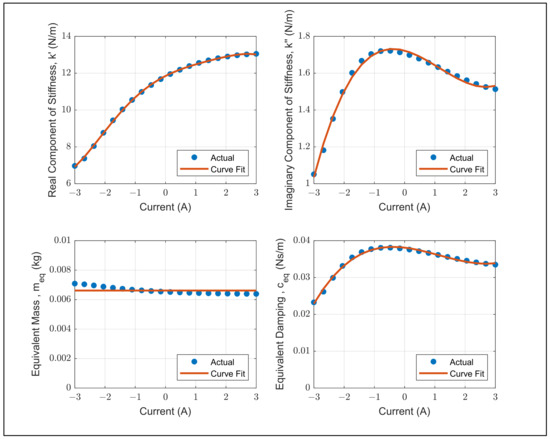 Equations (22) and (23) show that the equivalent mass and equivalent stiffness are dependent on the mode shape, which is also dependent on the stiffness of the MRE. The equivalent damping under harmonic loading is simply the loss component of stiffness scaled down by the operating frequency. Therefore, the equivalent mass, spring, and damper are dependent on the input current as this drives the stiffness of the MRE. Curve fitting using the least-squares minimization method is used to obtain the functional relationship between each equivalent system parameter to the input current. Figure 9 visually shows the goodness of fit for each obtained polynomial by least-squares minimization to the data points obtained. The field-dependent functional relations for storage and loss components of stiffness, equivalent mass, and equivalent damping with respect to applied current are found to be