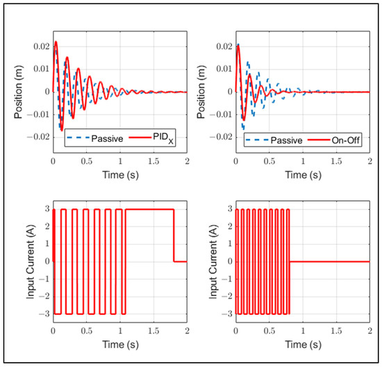 A shock, or impulse, response can be represented as a free vibration problem with zero initial displacement and non-zero initial velocity. Under an initial velocity of 1 m/s and zero initial displacement, each controller is tested to examine their capabilities in decreasing both settling time and peak value. The controller is considered due to its capability of minimizing settling time. The summary of the results for the settling time and peak response of the MRE-based equivalent SDOF system under shock response for different control methods are provided in Table 6. Figure 10 compares the time response and input current time history of the passive system with those of semi-active systems using and on–off control strategies. Each controller type is capable of lowering the settling time when comparing with the passive system. However, the peak value for the -controlled system is higher than the passive case, which is because the controller has an input value of 3 A during the first peak, resulting in a higher percent overshoot due to a decrease in damping ratio. The on–off, overall, is the better performer as it is capable of approximately halving the settling time while slightly decreasing the peak value.