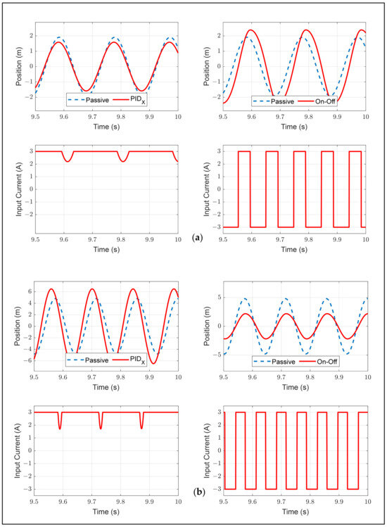 In the case of harmonic loads, vibration attenuation is achieved by lowering the steady-state amplitude. Results for the steady-state harmonic response and control current under harmonic force with excitation frequencies set at 5.14 Hz and 7.06 Hz are shown in Figure 11. The steady-state amplitudes are summarized in Table 7. Overall, the on–off controller provides safe vibrations for all input frequencies except when operating at lowest frequency of 5.14 Hz. Amplification at 5.14 Hz occurs since the on–off controller has a fundamental frequency of 5.14 Hz when at −3 A. The controller can provide good attenuation at all frequencies except at 7.06 Hz because of the tendency of having an input current of 3 A, which causes the input frequency to match the fundamental frequency.