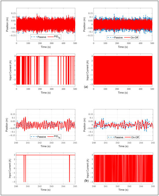 The random response is generated with respect to a white noise power input of 1 mW, so that the MRE deflects with small shear strain. A summary of the random vibration response can be found in Table 8. The controller is selected over the other PID-type controllers because it has a lower RMS displacement. Figure 12 show the time response over a time interval of 50 s. Visualizing the input current over a smaller interval helps in understanding the behavior of the different controllers. A comparison of the different controllers shows that the on–off controller is better at attenuating the RMS displacement by 23.5%. The controller has almost no change in RMS displacement compared with the passive case. Although the on–off controller is capable of good vibration suppression, the control input for the on–off controller shown in Figure 12 is subject to chatter [31]. In context, this would mean that there would be a high amount of switching between the on and off state over a short period of time.