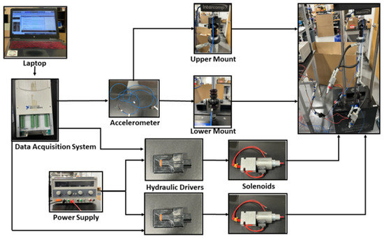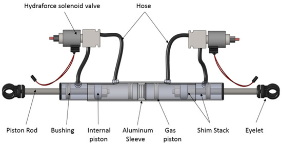 The fundamental components of the double damper are depicted in Figure 1. Consisting of two smaller shocks joined together with an aluminum sleeve, its assembly involves precisely machining the eyelets of the shocks to facilitate secure assembly against each other, fastened in place with a bolt through each. Each individual damper’s construction mirrors that of a single shock, essentially comprising two smaller shocks combined to match the size of a single unit. This design allows for effortless separation of the double damper into two individual dampers, thereby streamlining maintenance and servicing procedures. Additionally, solenoid valves are employed to provide input voltage to the controllers.