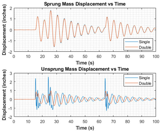 To further explore damper behavior under continuously fluctuating road conditions, a sinusoidal wave with an amplitude of 0.1 inches and a frequency of 25 Hz was introduced into the existing road input, as depicted in Figure 6. The simulation results, particularly regarding unsprung mass displacements, highlight the double damper’s effectiveness in attenuating high-frequency sine oscillations in the road input compared to the single semi-active damper employing the same control logic, as evidenced in Figure 7. Furthermore, the double damper exhibits superior damping of sprung-mass oscillations compared to the single damper, albeit with a less pronounced difference. Notably, both dampers demonstrate nearly identical steady-state behavior, underscoring the efficacy of the double-damper configuration in damping oscillations across the system. Additionally, the double damper provides better damping for the oscillations of the sprung mass compared to the single damper. Although the difference is not as significant, both dampers show nearly identical behavior once they reach a steady state.