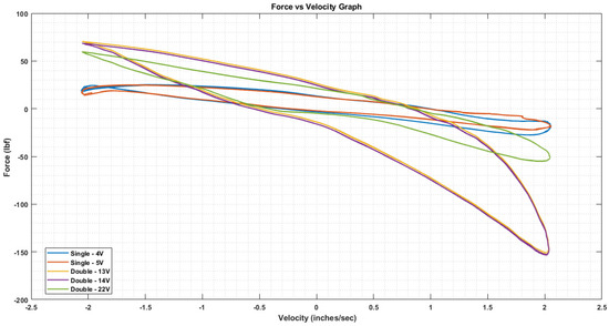 Force vs. velocity for the single and double damper tested with different combinations of voltages at 2 in/sec.