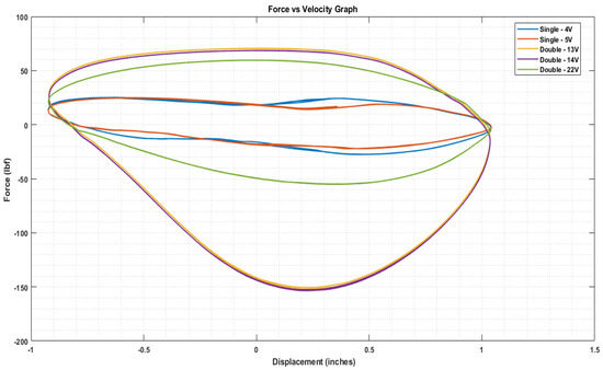 The experimental setup for damper testing depicted in Figure 8 provided a platform to evaluate the performance of the dampers. The shock dynamometer testing is conducted within the frequency range of 0.25 Hz to 3 Hz, effectively capturing a spectrum of vehicle dynamics including yaw, roll, and pitch dynamics [16]. Both the single and double dampers are subjected to testing at a suspension velocity of 2 in/sec on the shock dynamometer. This testbed machine facilitates systematic evaluation of the dampers’ responses across a range of velocities, enabling detailed analysis of their force-vs.-velocity characteristics. As presented in reference [15], by subjecting the dampers to varying velocities, the testing captures their performance under dynamic conditions representative of real-world driving scenarios. The force-vs.-velocity graphs illustrate the force buildup characteristics with varying velocity.