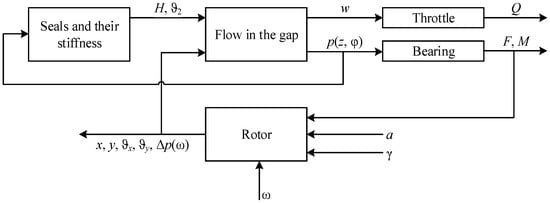 The model of the hydromechanical system with “rotor-slotted seals” is shown in Figure 2.