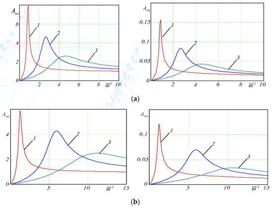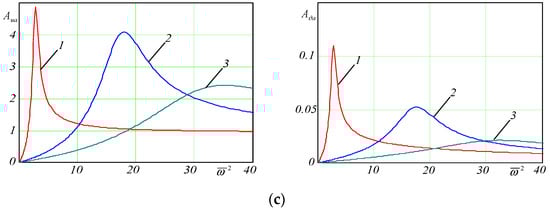 Amplitude–frequency characteristics as a response to statistic unbalance: (a) ; (b) ; (c) . 1—; 2—; 3—.