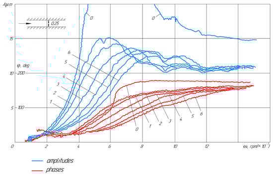 Amplitude (A) and phase (φ) frequency characteristics of the rotor in gap seals (experimental data); ω is a rotor rotation frequency; compaction pressure in MPa: 0—0; 1—0.18; 2—0.2; 3—0.4; 4—0.6; 5—0.8; 6—1.0.