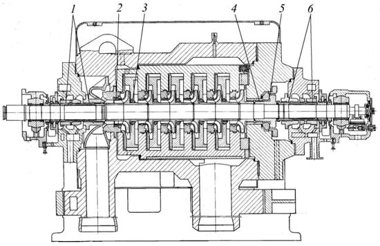 The turbo-feed pump (Figure 7) was designed to pump (1350 m3/h) water at a temperature of 165 °C under a pressure of 35 MPa into steam boilers of steam turbine blocks of thermal power plants with a capacity of 800 MW [].