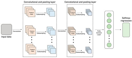 A typical neural network consists of the following elements: convolutional layers, pooling layers, a fully connected layer with a standard classification model, and an activation function at the end to conclude the classification. An example of this type of network can be seen in Figure 2. This architecture is effective in image classification, object recognition, and tasks related to computer vision ([9,13]).