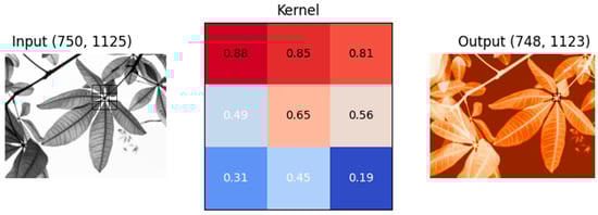 The operation of kernels involves traversing the input matrix and extracting the most relevant features from the image. In other words, these elements are square matrices representing “weights” that enhance what is most important (such as edges, contrasting regions, and defined shapes) ([13]). An example of how kernels function can be seen in Figure 3.