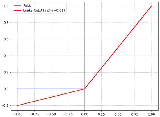 Considering the issue with the ReLU function, the LeakyReLU variant has been introduced. In this function, the negative part does not become zero but instead becomes a linear function with a small positive slope. This reduces the chance of returning zero values and mitigates the problem of the “dead neuron”. It is calculated with Equation (14) and can be visualized in Figure 4 alongside the ReLU function.