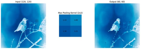 The structure of a layer with max pooling can be seen in Figure 5. In this example, the highest value in the kernel for the analyzed point is 1.3, so that value is chosen. It is noteworthy that, despite reducing both X and Y by half, the output still manages to preserve the main characteristics of the original image.