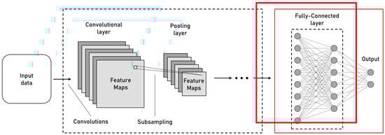 After passing through one or more sets of convolutional and pooling layers, a CNN is finalized with a fully connected (FC) network and a classification function. The FC network connects each neuron in one layer to every neuron in the adjacent layer. The primary function of the FC layer is to convert the 2D feature maps into a 1D feature vector and synthesize the local information in the simple features extracted by the convolutional and pooling layers. Finally, the processed feature vector is fed into the softmax layer, calculated with Equation (15), to produce the probability score for each class, and the class with the highest score will be the classification result. In Figure 6, the FC layer and the output layer can be observed on the right.