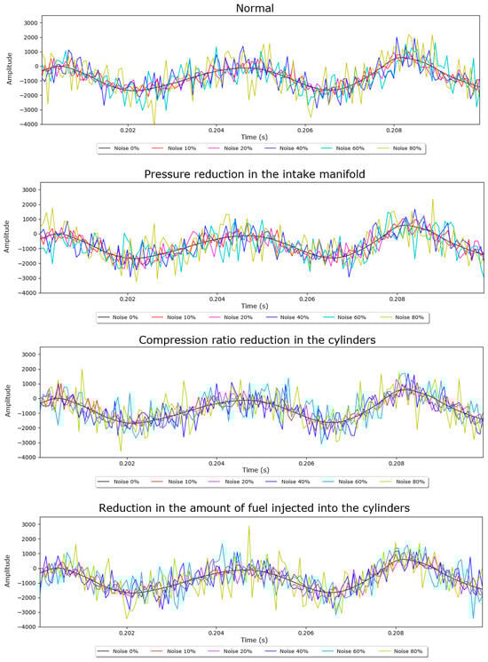 To evaluate the results obtained from the described methodology, Figure 18 presents the vibration signals transformed by CWT for each type of condition studied and at each noise level. In this case, the impact of noise is already noticeable at 10%, becoming more intense at higher levels. This aligns with the method’s sensitivity to frequency variations over time.