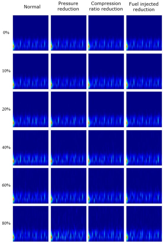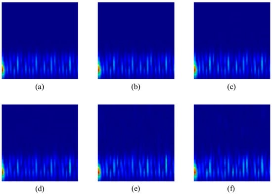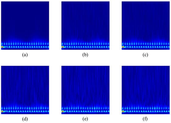 Examples of scalogram with noise, normal condition: (a) 0%, (b) 10%, (c) 20%, (d) 40%, (e) 60%, and (f) 80%.