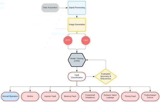 To provide a clear overview of the proposed methodology, a block diagram along with the corresponding algorithm is presented in Figure 15. This diagram outlines the key steps involved in the fault detection process, including data acquisition, signal processing, image generation, model training, fault classification, and evaluation. The algorithm accompanying the block diagram details the sequential procedures followed in this study, highlighting the integration of short-time Fourier transform (STFT) and continuous wavelet transform (CWT) techniques with convolutional neural networks (CNNs) to accurately classify various engine fault types.