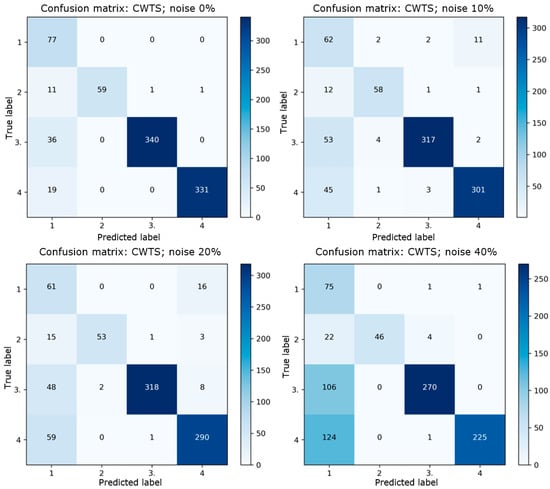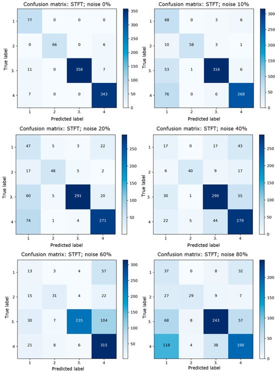 Set of confusion matrix for STFT for each noise case, where: (1) is normal, (2) is pressure reduction, (3) is compression ratio reduction, and (4) is fuel reduction.