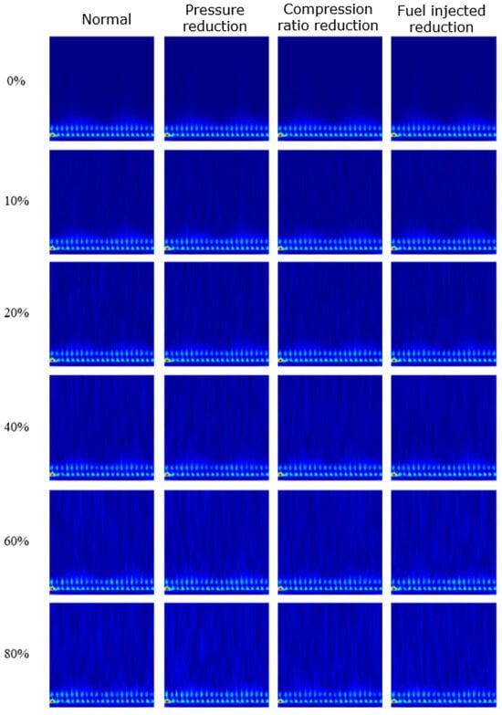 Examples of spectrogram with noise, normal condition: (a) 0%, (b) 10%, (c) 20%, (d) 40%, (e) 60%, and (f) 80%.