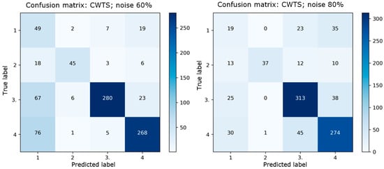 In Table 2, detailed accuracy values for each transform are provided, categorized by noise level. It is evident that, in both cases, using each transform yielded approximately comparable values up to 40% noise, followed by a sharp decline when using STFT and a consistent performance when using CWT.