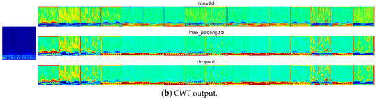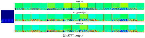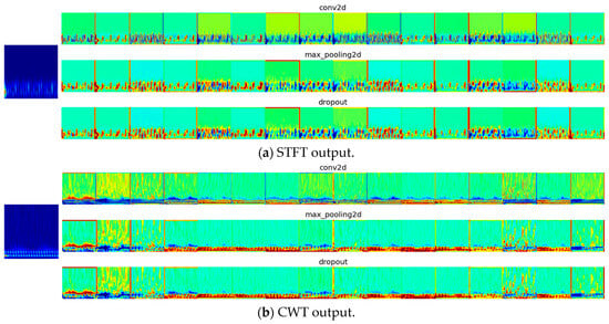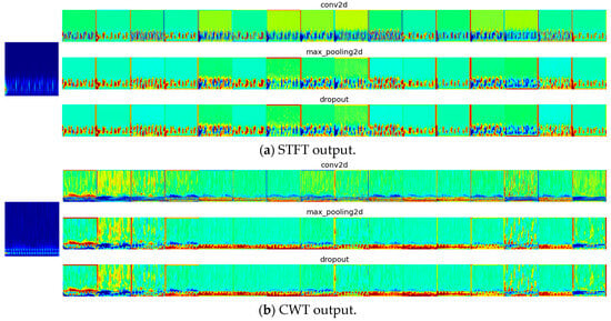 From Figure 20, Figure 21, Figure 22 and Figure 23, the output of the initial convolutional layers, pooling, and dropout layers for both the STFT and CWT networks can be observed for each case among the classes with 20% noise (as an example). The figures depict the filtering of characteristics and the selection of the most relevant ones, highlighted by more intense colors. Additionally, the output of the max-pooling layer, which selects the most intense features, is noteworthy.