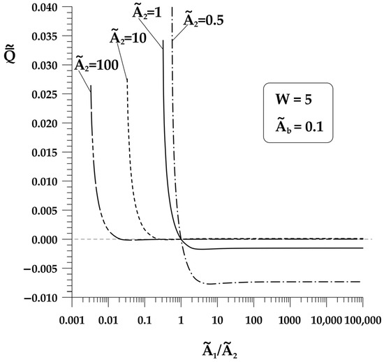 If the gate valve is absent and the two tanks have equal cross-sectional areas (A1 = A2), the coefficient D(t) of the nonlinear term of Equation (8) becomes zero, as well as the net flow rate. Since the tube area varies harmonically in time and there are no flow asymmetries with respect to the mid-length of the tube, the fluid moves back and forth without being transferred from one tank to the other. However, when A1 differs from A2, the hydraulic loss coefficients ξ1,2 and ζ1,2 are different, inducing flow asymmetries so that the flow becomes, on average, unidirectional, directed from the smaller to the larger tank. Figure 3 shows the net flow rate as a function of the ratio of the cross-sectional areas of the tanks for various values of , by keeping constant the frequency of the tube oscillation (W = 5) with a 10% tube area amplitude (). It is known that for small W values (e.g., W < 1), the flow in a tube is quasi-steady. However, by progressively increasing W, the unsteadiness of the flow becomes dominant, changing the parabolic velocity profile to a flatter one [25]. In the present case, the spatial change in the velocity in each cross-section is not taken into account since the flow is assumed to be one-dimensional, and a spatially average velocity is considered in each tube cross-section.