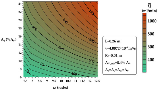 Figure 9 shows the net flow rate iso-contours as a function of both the inflation of the balloon—which is related to Ab—and the heart rate. According to Figure 9, the generated net flow rate takes a maximum value close to 1 L/min for a frequency of 2 Hz and Ab = 24% of A0. Nevertheless, it has to be remembered that in real applications, the arterial tree plays a significant role in the pump’s performance, such as its compliance, which has been shown to reduce the balloon efficiency when this increases [32]. Of course, the procedure, although relatively simplistic, is able to reproduce the basic features of the pump.