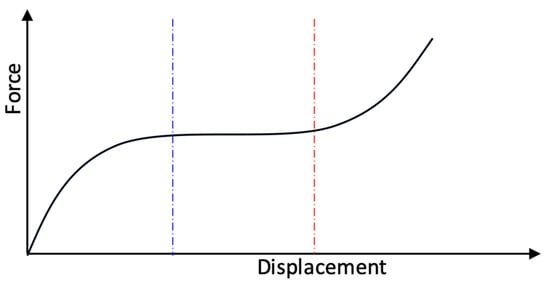 The origami considered in the present study is an HSLD stiffness vibration isolator, whose system has a high static stiffness, which is useful for a low static displacement, and a low dynamic stiffness, which, in turn, is useful for proper isolation, the reduction in the natural frequency, and the increase in the isolation region [11]. The vibration isolator can achieve a QZS around the equilibrium point. This characteristic behavior is due to a highly nonlinear force: the force–displacement curve is shown in Figure 1, the system does not satisfy Hook’s law [22], and the stiffness presents a minimum in a wide central interval of displacement and increases for low and high force levels.