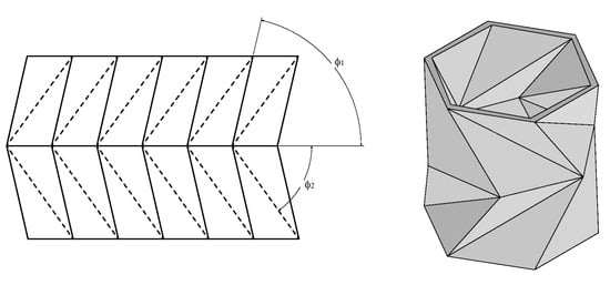 - Zhang, Q.; Cai, J.; Li, M.; Feng, J. Bistable behaviour of a deployable cylinder with Kresling pattern. In 7th International Meeting on Origami in Science, Mathematics and Education (7OSME); Oxford University: Oxford, UK, 2018; Available online: https://www.researchgate.net/publication/335925217_Bistable_behaviour_of_a_deployable_cylinder_with_Kresling_pattern (accessed on 14 November 2024).