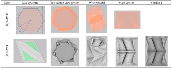 KOM-II and KOM-III are simplified models that address manufacturing concerns. Further variants of KOM are KOM-Ia, KOM-IIa, KOM-IIIa, and KOM-IVa, which are basically the same models presented previously; however, the intersecting construction plane in the middle of the structure and aligned with the base and top planes is removed, see Figure 3, version a.