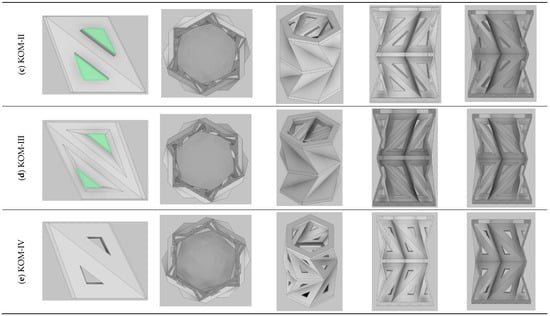 The geometry is defined starting from the one proposed in Refs. [26,27]. Five different types of origami are analyzed: KOM-0, KOM-I, KOM-II, KOM-III, and KOM-IV. The geometric parameters used in the following investigations are shown in Table 1.