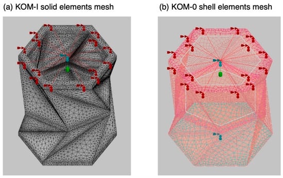 The initial step is to select the appropriate element to represent the origami. Given that the mechanism relies on planar oblique facets and horizontal plates, both solid elements and shell elements are viable options. On the KOM-0 and KOM-I models, we analyzed which of the two elements (solid or shell) would best suit our purposes; Figure 4 shows the FEM mesh for the two types of elements. In order to assure sufficient accuracy, a parabolic formulation was applied to both finite elements. The simulation parameters are shown in Table 3.