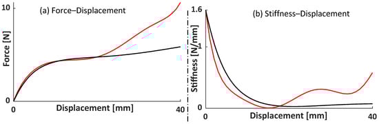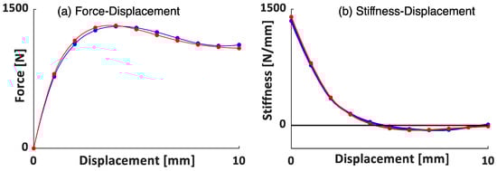 Comparison between the following: (a) Force–displacement; (b) Stiffness–displacement characteristics: ▬ Experimental results; ▬ FEA results.