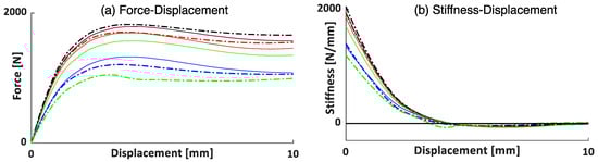 Comparing all eight cases in terms of the following: (a) Force–Displacement; (b) Stiffness–Displacement ▬ KOM-I; ▬ ● ▬ KOM-Ia; ▬ KOM-II; ▬ ● ▬ KOM-IIa; ▬ KOM-III; ▬ ● ▬ KOM-IIIa; ▬ KOM-IV; ▬ ● ▬ KOM-Iva.