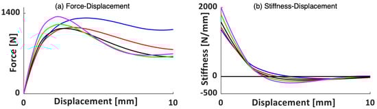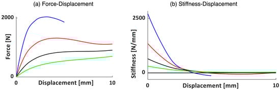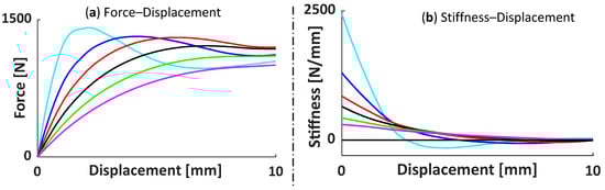Evaluating the effect of base length, ; (a) Force–Displacement, (b) Stiffness–Displacement: ▬ ; ▬ ; ▬ ; ▬ ; ▬ ; ▬ .