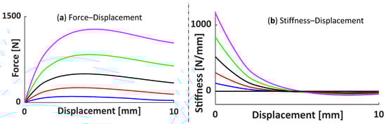 Evaluating the effect of middle plane height. (a) Force–Displacement, (b) Stiffness–Displacement: ▬ ; ▬ ; ▬ ; ▬ ; ▬ .
