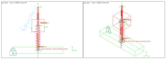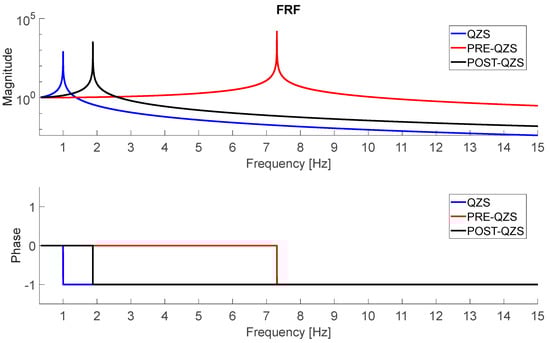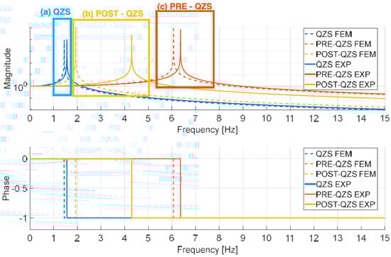 Figure 26 and Table 10 show that the FEM model aligns well with the experimental data in the PRE-QZS and QZS regions (blue box and red box in Figure 26), exhibiting an error for the natural frequencies in those working zones of less than 10%. The model spring characteristics, mimicking the KOM system, closely resemble the curve presented in Figure 25, particularly in the first two working zones. Conversely, a notable error is expected in the POST-QZS working zone, highlighting the substantial difference between the experimental stiffness and the FEM stiffness. In the POST-QZS working region, from 20 mm to 40 mm, there is a consistent discrepancy in stiffness–displacement behavior, as seen in Figure 25b, between the experimental and FEA results. As explained in the previous paragraph, this difference leads to a lower stiffness behavior in the dynamic simulation that uses the FEM results. This variance underscores the limitations of the FEM model in capturing certain nonlinearities present in the experimental setup.